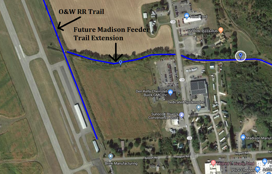 Extension of the Madison Feeder Trail The Madison Feeder Trail currently ends at Route 12B. The plan is to extend the trail along the feeder to the O&W RR Trail adjacent to the Hamilton Municipal Airport. Click picture for larger version.